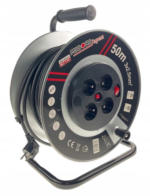 50M 3×2.5MM produžni kabel s uzemljenim kolutom marke Midori Japan certificiran je prema najvišim standardima električne sigurnosti. Također ima zaštitu od slučajnog ispadanja iz utikača i otpornost na mehanička oštećenja. To ga čini ne samo učinkovitim, već i sigurnim alatom za korisnika.