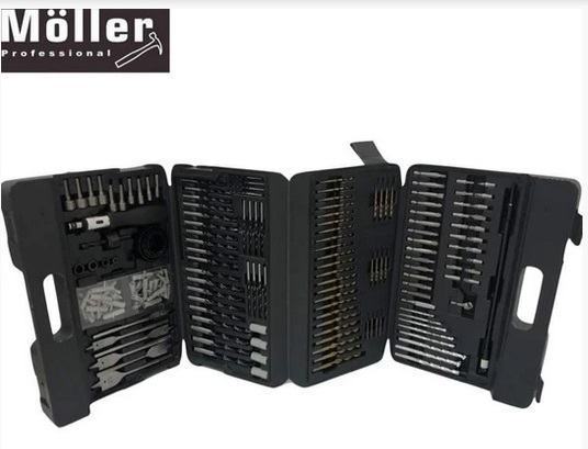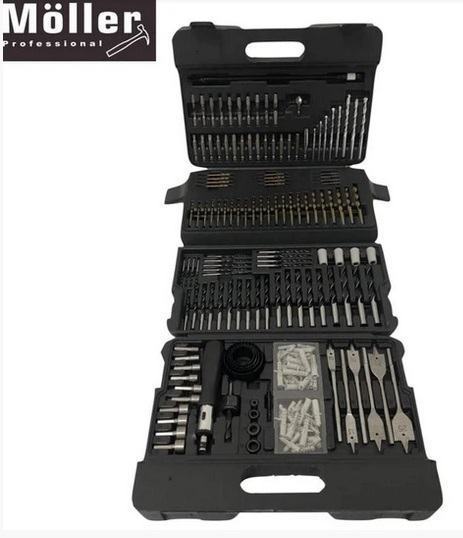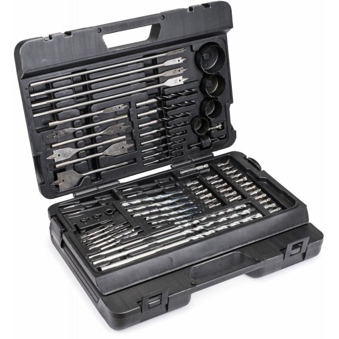 Komplet pribora sastoji se od 204 ručna elementa, omogućuje vam obavljanje raznih zadataka. Set uključuje nastavak za drvo, nastavak za metal, nastavak za beton, manje nastavke, centralne nastavke, kružne pile za rupe, šesterokutne nastavke, imbus nastavke, šesterokutne ključeve, adaptere. Sav pribor smješten je u čvrstu kutiju s uklonjivom pregradom, zahvaljujući kojoj skladištenje i transport tako velikog kompleta neće stvarati probleme. Pojedinačni dodaci imaju posebno mjesto, što će olakšati održavanje reda u kutiji.